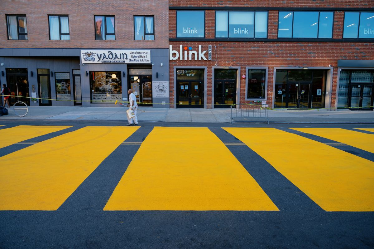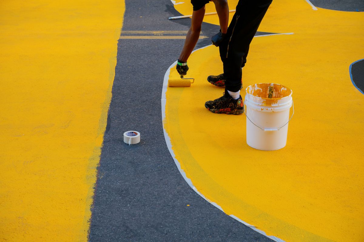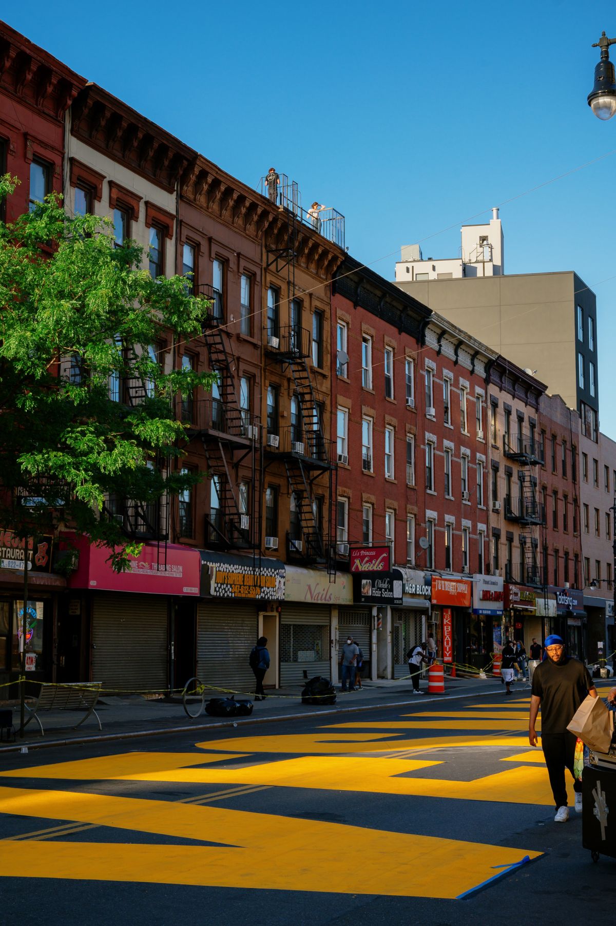 The graphic designer in me really appreciates the attention to typographic detail at scale here. I watched a group of painters tightening up the eye and leg of the R. They first painted the street over the weekend, then came back to make it better.