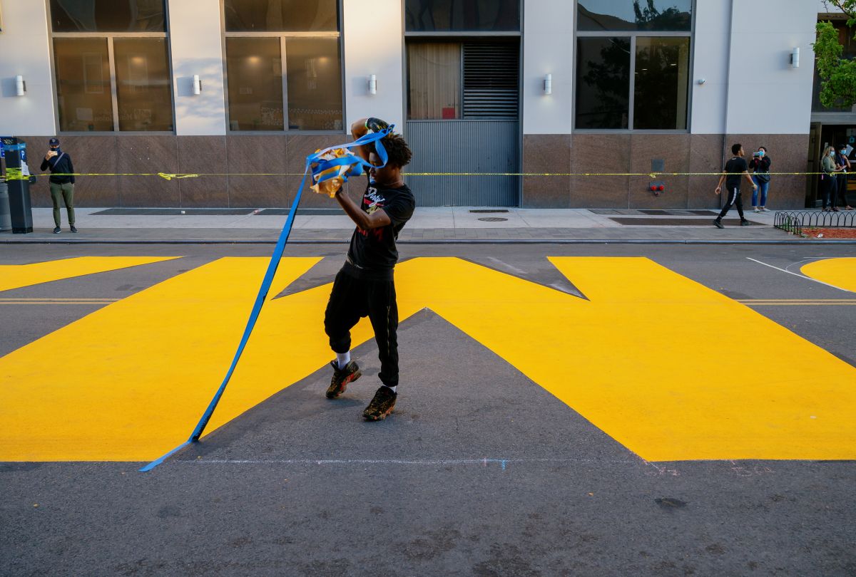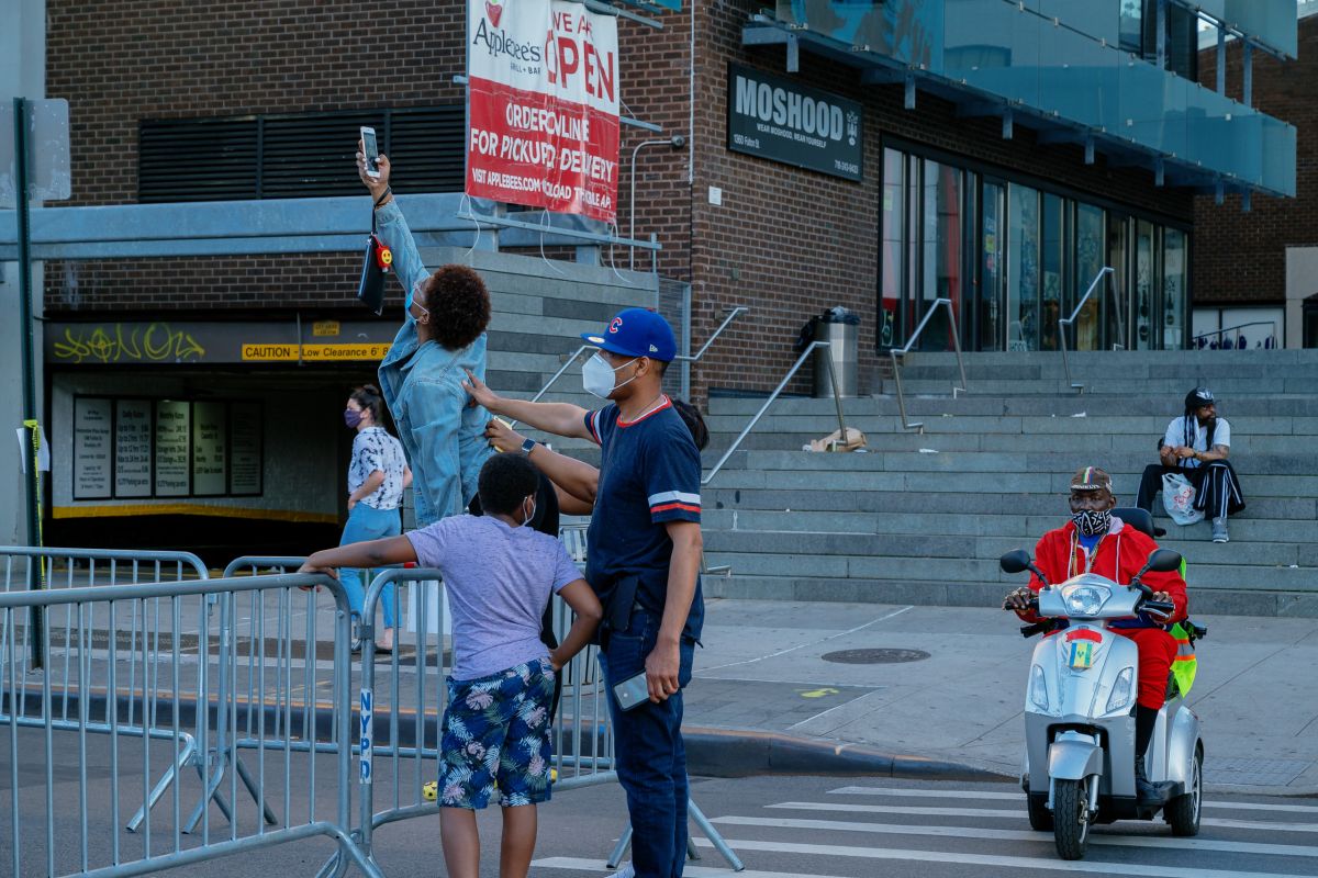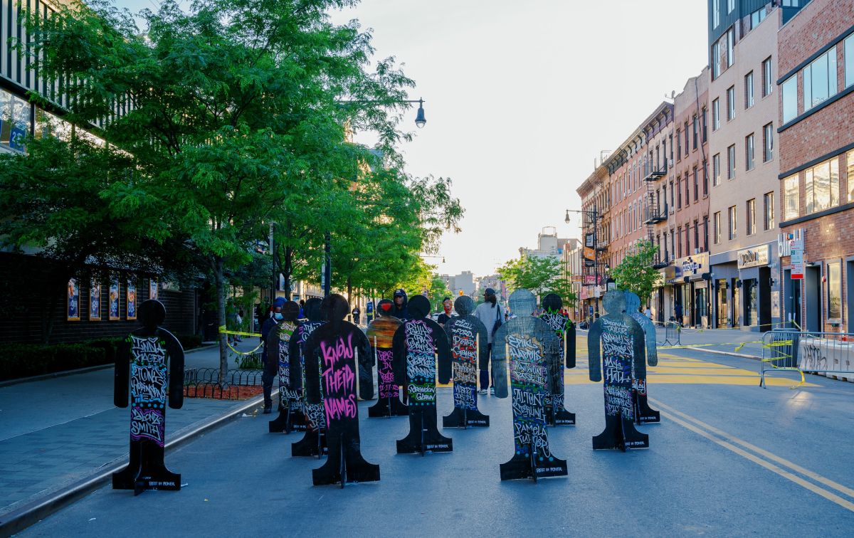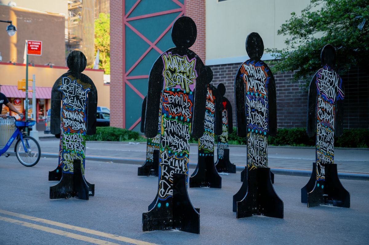 Their face in the frame or not, people are seeing themselves. Black lives are affirmed by both the text on the street and also reminded of threat to them by wooden silhouettes bearing names of those recently slain. Some folks are posing hard, working their good angles, telling their cameraman not to make them look fat. Some are just trying to get the angle to capture the magnitude of the mural. The are drones above recording it all. Most people appear to be here to be here, to witness this place, be here for the moment.