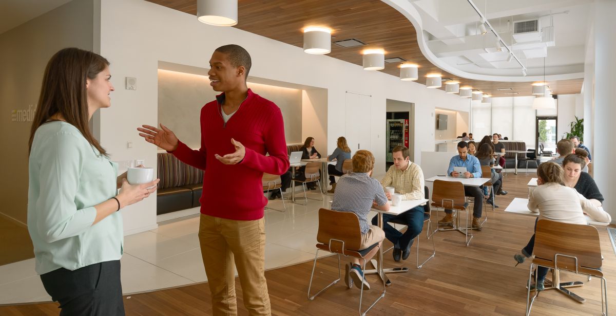 An organized shoot with Medidata's employees to create a welcoming image. The intent was showing the staff and the modern architecture of the offices. This is the employee cafe are. The image is used on the company's job listings and career page on their website.